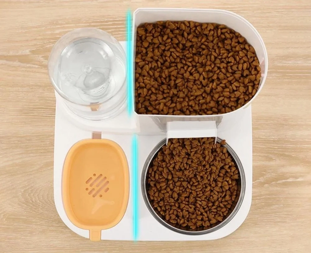 Aynı anda 2 kasede yiyecek ve su dağıtmasını sağlayan çift kaseler ile tasarlanmış 2'si 1 arada otomatik evcil hayvan besleyici 'dir.